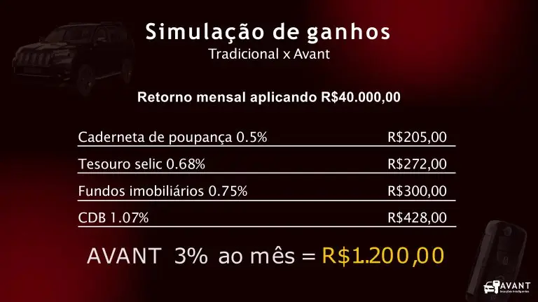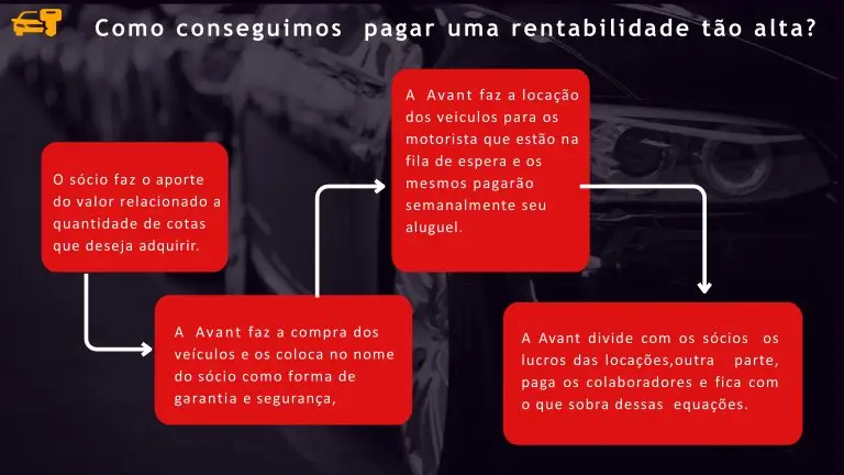 Com R$ 45.000,00, compramos o carro e com o credenciamento do motorista o repasse é de R$ 150,00 por mês por cada R$ 5.000,00 durante quarenta e oito meses.