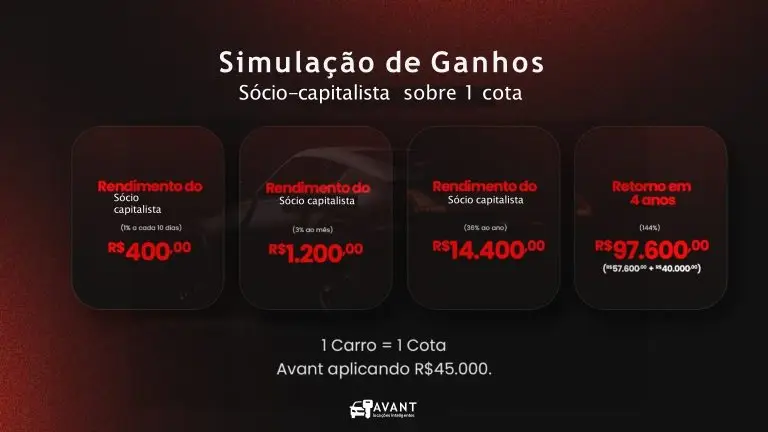 O carro fica no nome do Sócio Capitalista até o quadragésimo oitavo (48) mês; só muda a titularidade com o recebimento de R$ 57.600,00.